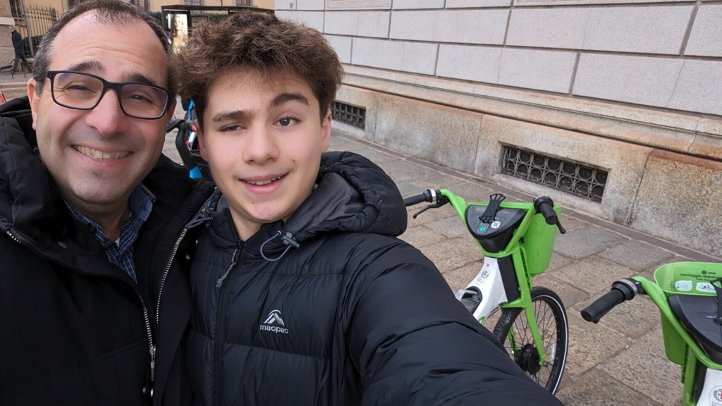 By this time Olivia was starting to feel unwell – coming down with something perhaps so headed home for lunch and a rest. Sebastian and Joe headed out in search of new SIM cards but ended up zooming around the city on some e-bikes!